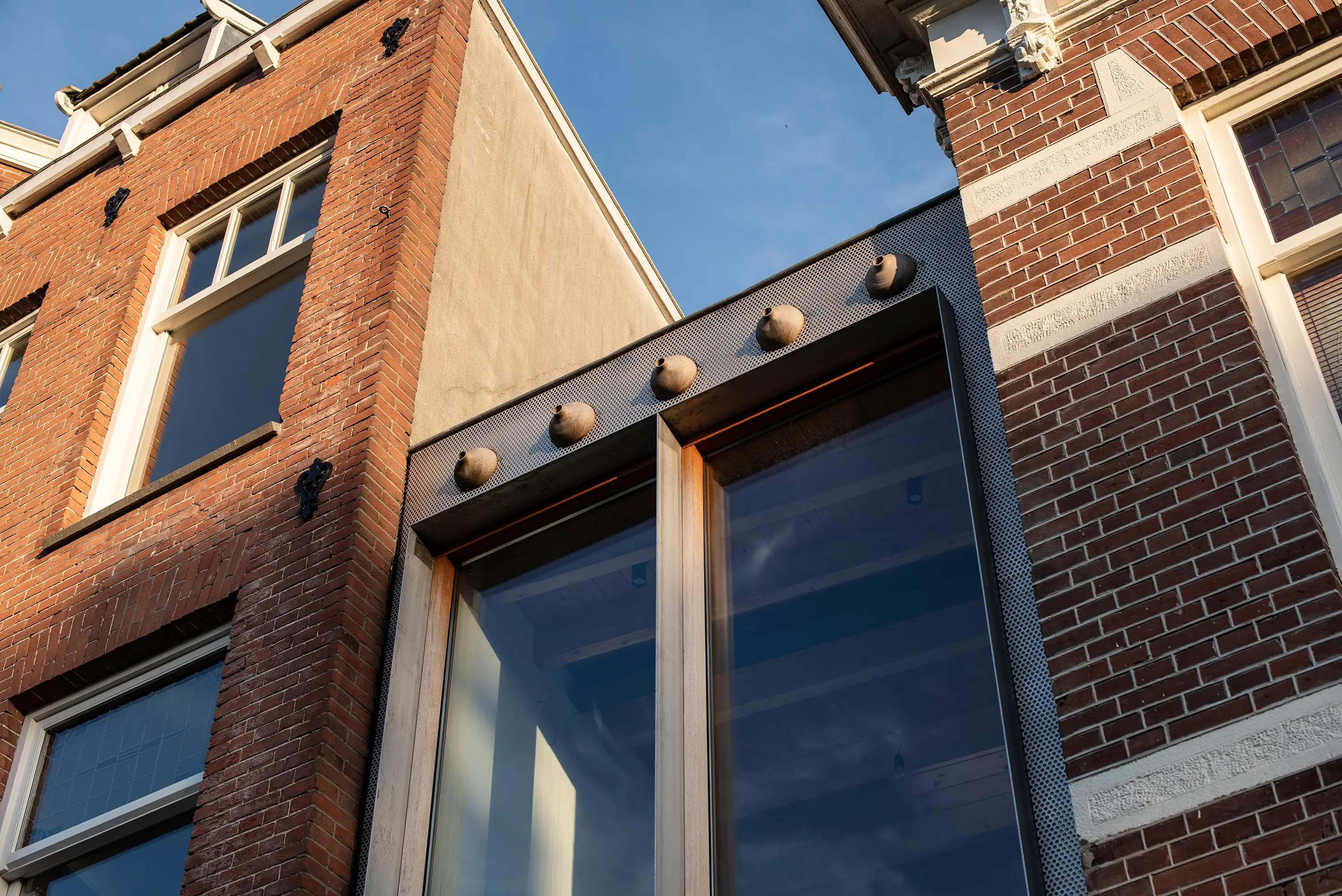 Vijf op maat gemaakte geïntegreerde vogelhuisjes in de voorgevel bieden een thuis voor mussen
