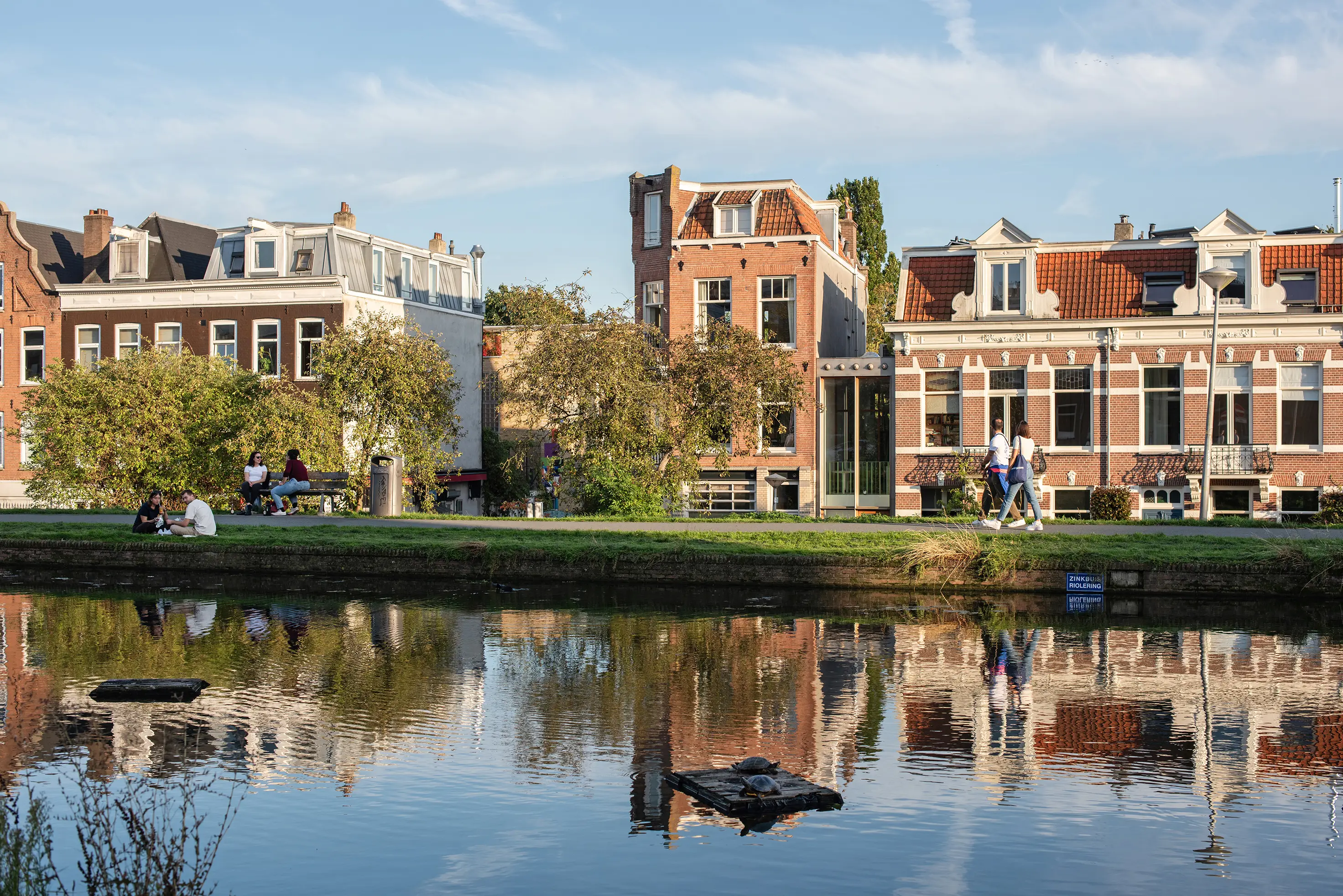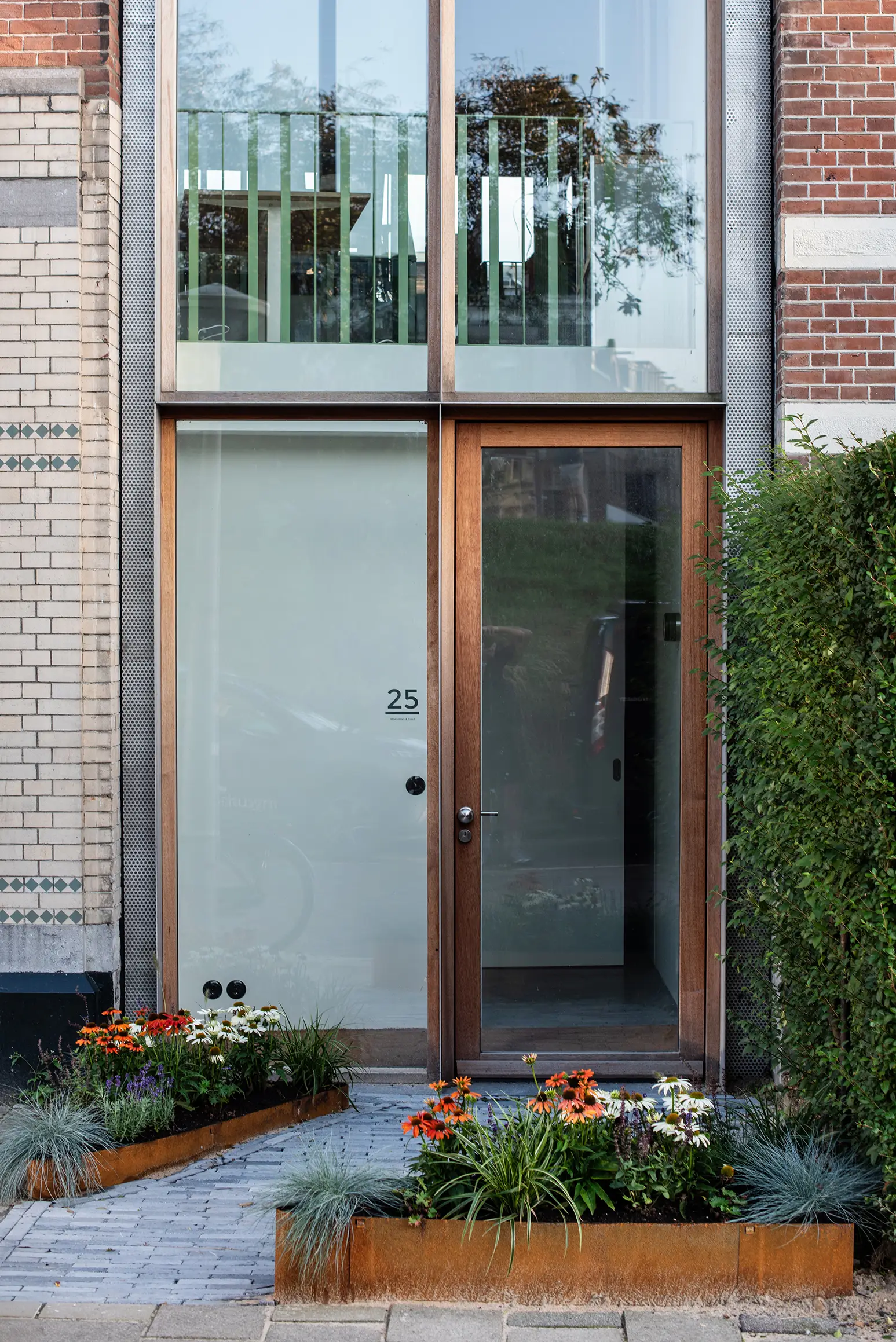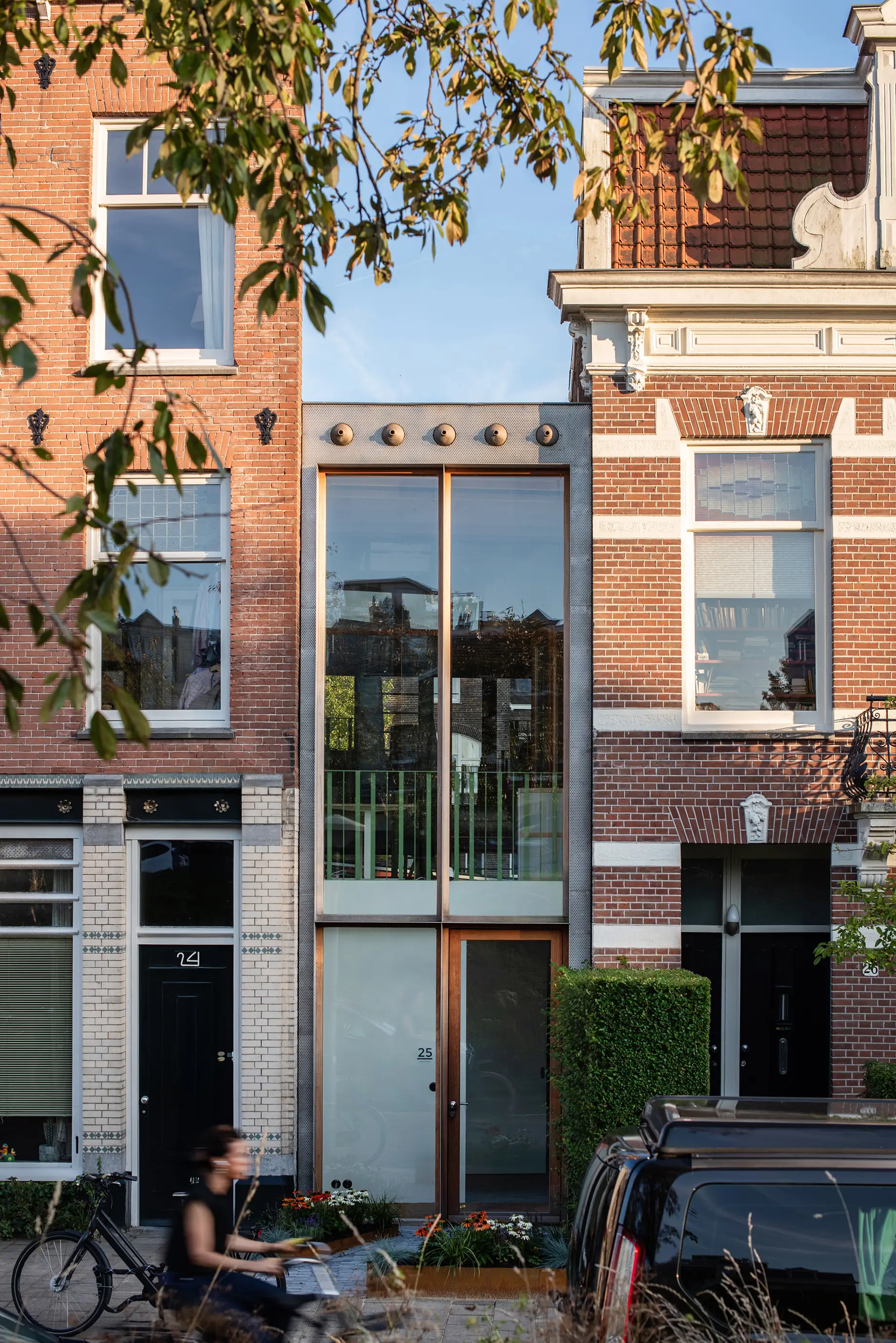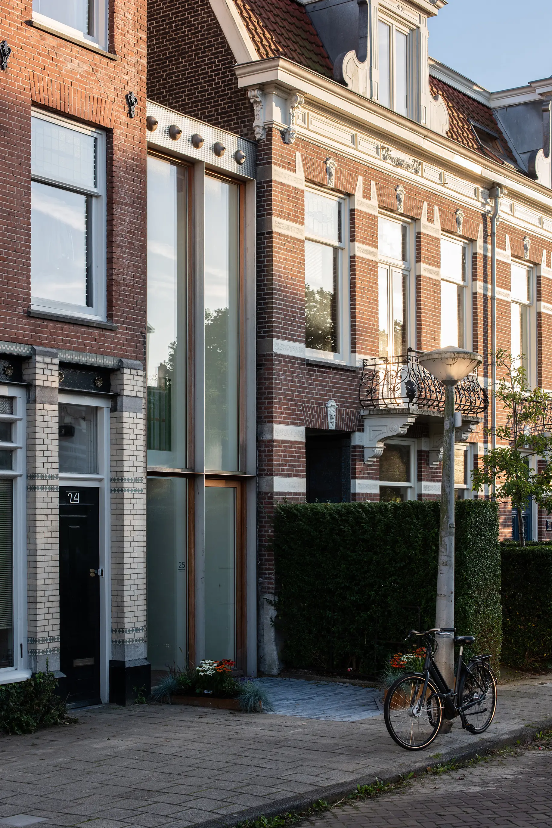 Gesandwiched tussen twee typische Amsterdamse huizen ligt een smal perceel van 2,5m breed en 24m diep. Deze afmetingen vroegen om een creatieve aanpak voor de invulling van deze nieuwbouwwoning met twee verdiepingen.